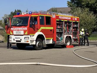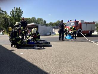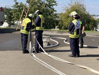 Die Schläuche für die Brandbekämpfung werden vorbereitet.