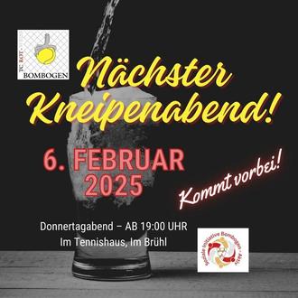 Zusammen mit der Initiative "Bombogen Aktiv" veranstaltet der Tennisclub Rot-Weiß Bombogen im Clubhaus in Brühl am Donnerstag, 06.02.2025, ab 19 Uhr den nächsten Kneipenabend. Alle Bewohner aus Bombogen und den umliegenden Ortschaften sind willkommen! Genießt einen geselligen Abend mit erfrischenden Getränken und netten Gesprächen.