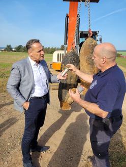 Kurt Mazzucco erklärt Bürgermeister Joachim Rodenkirch erfolgreicher Entschärfung den Zündmechanismus der Fliegerbomben.