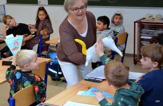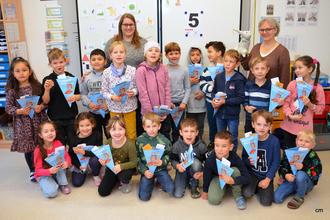 In der kleinen Schultüte, die jedes Kind im Anschluss erhielt, war deshalb neben einem Elternbrief auch ein Gutschein für einen Büchereiausweis, dazu ein Goldtaler und ein schmales, buntes Heftchen mit dem seltsamen Titel „Das dickste Buch der Welt“. Was es damit auf sich hat, wollten alle Kinder zuhause gemeinsam mit den Eltern herausfinden. Aber vorher versprachen alle per High Five Leslie in die Hand, dass sie selbst im Laufe des ersten Schuljahres Lesen, Schreiben, Rechnen und noch viele andere Dinge lernen wollten. Im Gegenzug sicherte Leslie einen erneuten Besuch im kommenden Jahr zu, bei dem sie alle eifrigen Wissensschätze-Sammlern ein Geschenk mitbringen wird.