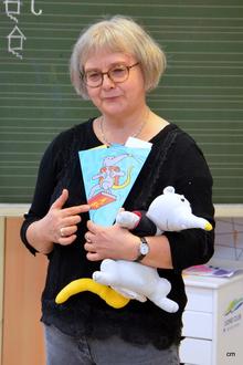 In der kleinen Schultüte, die jedes Kind im Anschluss erhielt, war deshalb neben einem Elternbrief auch ein Gutschein für einen Büchereiausweis, dazu ein Goldtaler und ein schmales, buntes Heftchen mit dem seltsamen Titel „Das dickste Buch der Welt“. Was es damit auf sich hat, wollten alle Kinder zuhause gemeinsam mit den Eltern herausfinden. Aber vorher versprachen alle per High Five Leslie in die Hand, dass sie selbst im Laufe des ersten Schuljahres Lesen, Schreiben, Rechnen und noch viele andere Dinge lernen wollten. Im Gegenzug sicherte Leslie einen erneuten Besuch im kommenden Jahr zu, bei dem sie allen eifrigen Wissensschätze-Sammlern ein Geschenk mitbringen wird.