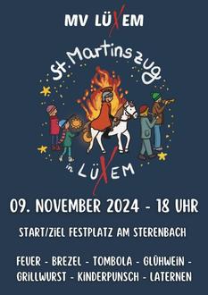 Am Samstag, 9.11.2024, 18 Uhr zieht St. Martin wieder durch folgende Lüxemer Straßen: Grünewaldstraße, Im Bungert, Bombogener Straße, Felsenstraße, Am Sterenbach. Start und Ziel des St. Martinszugs ist am Festplatz in der Dorfmitte. Dort hat auch das Martinsfeuer eine neue Stelle gefunden: Es wird neben dem Festplatz brennen, damit es länger bestaunt werden kann und zu einer gemütlichen Atmosphäre nach dem Umzug beiträgt. Aus Sicherheitsgründen muss es an dieser Stelle aber etwas kleiner ausfallen.