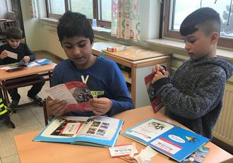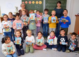 Da sich nach übereinstimmender Aussage der Lehrkräfte alle Kinder nach Kräften bemüht hatten, stand der Geschenkübergabe nichts mehr im Wege. Annette Münzel von der Stadtbücherei konnte so vor den Herbstferien – tatkräftig unterstützt von der Bücherei-Leseratte Leslie - in 14 Klassen insgesamt 216 BücherMAX!-Pakete verteilen.