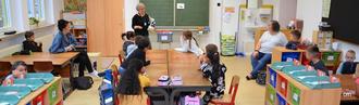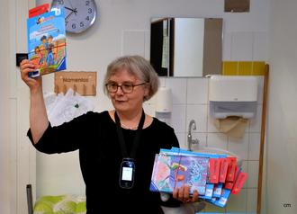 Da sich nach übereinstimmender Aussage der Lehrkräfte alle Kinder nach Kräften bemüht hatten, stand der Geschenkübergabe nichts mehr im Wege. Annette Münzel von der Stadtbücherei konnte so vor den Herbstferien – tatkräftig unterstützt von der Bücherei-Leseratte Leslie - in 15 Klassen insgesamt 273 BücherMAX!-Pakete verteilen.
