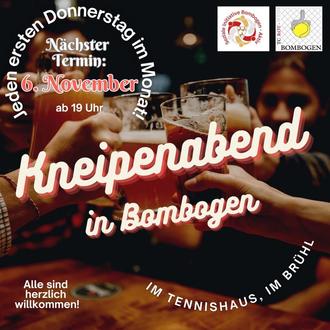 Zusammen mit der Initiative "Bombogen Aktiv" veranstaltet der Tennisclub Rot-Weiß Bombogen im Clubhaus Im Brühl am Donnerstag, 06.11.2025, ab 19 Uhr den nächsten Kneipenabend. Alle Bewohner aus Bombogen und den umliegenden Ortschaften sind herzlich willkommen! Genießt einen geselligen Abend mit erfrischenden Getränken und netten Gesprächen.