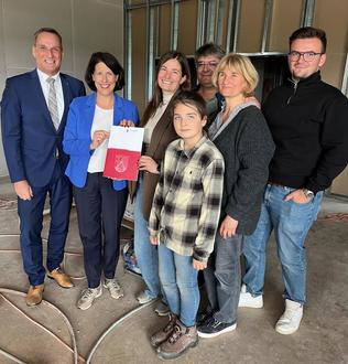 Übergabe des Förderbescheides durch Ministerin Daniela Schmitt mit Bürgermeister Joachim Rodenkirch (l.) an die Familie Malzahn (Foto: Privat).