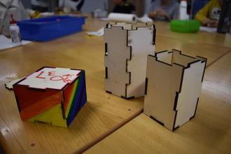 Den Auftakt machte am 24. Oktober der Holz-Workshop „Ab in die Kiste!“ mit Hermann-Josef Wehage für Fünft- und Sechstklässler, bei dem die Modelle zunächst am PC konstruiert und dann mit dem Lasercutter geschnitten wurden. Beeindruckend, wie es einem Teilnehmer gelang, seine Bauteile so exakt zu berechnen, dass drei Boxen nahtlos ineinanderpassten, analog einer russischen Matroschka. Es folgten Zusammenbau, Schmirgeln, Kleben, Bemalen und Beschriften – und am Schluss konnten alle stolz ihre ganz individuellen Holzkisten mit nach Hause nehmen.