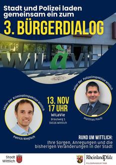 Die Polizei- und Kriminalinspektion Wittlich sowie die Stadt Wittlich laden alle Bürgerinnen und Bürger herzlich zum dritten Bürgerdialog ein. Die Veranstaltung findet am Donnerstag, 13. November 2025, ab 17 Uhr im Mehrgenerationenzentrum „WILàvie“, Brautweg 1, Wittlich, statt.