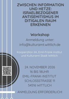Anlässlich des Gedenktags am 9. November organisieren das Emil-Frank-Institut und das Kulturamt der Stadt Wittlich einen zweistündigen Workshop, der die Teilnehmenden für Antisemitismus im digitalen Raum sensibilisieren soll. Der Workshop richtet sich an alle Interessierten, die ihre Kompetenz im Erkennen und Einordnen von Antisemitismus auf Social Media stärken möchten. Der Workshop vermittelt Grundlagen über Formen des israelbezogenen Antisemitismus im digitalen Raum und zeigt auf, wie sich antisemitische Narrative im Kontext des Nahostkonflikts auf Social Media verbreiten. Mithilfe konkreter Beispiele und praktischer Tools zur Analyse von Fake News und Propaganda erarbeiten die Teilnehmenden Strategien zur kritischen Medienanalyse. Ziel ist es, Zusammenhänge zu verstehen und Handlungssicherheit im Umgang mit antisemitischen Inhalten im Netz zu gewinnen, um aktiv gegen Antisemitismus im Internet vorgehen zu können.