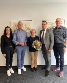 Bürgermeister Joachim Rodenkirch verabschiedet Martina Hayer (3. v. l.) in den wohl verdienten Ruhestand. Den guten Wünschen schlossen sich die Personalratsvorsitzende Christiane Schmitz-Hayer (1. v. l.), der Büroleiter Rainer Stöckicht (2. v. l.) sowie der Fachbereichsleiter I Jan Mußweiler (1. v. r.) gerne an (Foto: Theresia Rodenkirch).