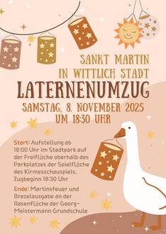In diesem Jahr startet der St. Martinszug am Samstag, 8. November 2025 auf der Freifläche Stadtpark oberhalb des Parkplatzes Rommelsbach - der Eingang findet sich über dem Parkplatz der Spielfläche des Kirmesschauspiels. Die Aufstellung findet um 18 Uhr statt, der Zug beginnt um 18:30 Uhr. Im Anschluss geht der Zug durch den gesamten Stadtpark und überquert hiernach die Straße ‚Am Stadtpark‘, weiter geht es über die Fußgängerbrücke zum Kindergarten Jahnplatz und entlang der Rasenfläche zur Georg-Meistermann-Grundschule. Auf der eingezäunten Rasenfläche wird das Martinsfeuer abgebrannt, der heilige St. Martin reitet um das Feuer und begrüßt alle teilnehmenden Kinder und Erwachsene. Die Brezelausgabe für die singfreudigen Kinder erfolgt im Anschluss durch St. Martin und seine Helfer am Fahrradständer neben der Turnhalle. Es sind ausreichend Brezeln für alle Kinder vorhanden.