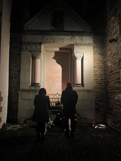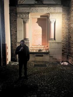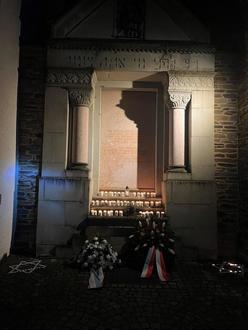 Um den mit Kerzen illuminierten Davidstern auf dem Pflaster standen schweigend alte und junge Menschen; sicherlich weilten die Gedanken 2023 häufig im Heiligen Land, wo die Hamas Tausende Juden tötete und somit einen schrecklichen kriegerischen Konflikt zwischen dem Staat Israel und der palästinensischen Terrororganisation auslöste. Dr. Marianne Bühler vom Arbeitskreis „Jüdische Gemeinde Wittlich“ schilderte einführend die grauenhafte Situation, alle 15 Minuten trugen dann Jugendliche Texte zur Situation 1938 z.B. in Osann-Monzel vor, wobei zum Schluss ein aktueller Brief des Enkels eines während des Nationalsozialismus vertriebenen Wittlichers aus Israel vorgelesen wurde.