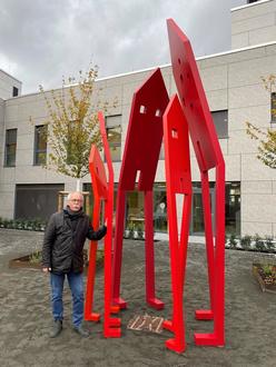 In einer abstrakten, minimalistischen Formensprache vermitteln die Kunstobjekte ein Bild der Gemeinschaft und Zusammengehörigkeit — ein Kunstwerk mit einladendem Charakter, das Zugewandtheit vermittelt und ein Wir-Gefühl erzeugt. In Korrespondenz zur Stadtfarbe Rot ist die Farbgestaltung der Kunstobjekte in kraftvollen Rottönen gehalten. Rot als Verkörperung von Dynamik, Wärme, Präsenz und vitaler Lebensfreude.