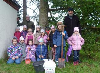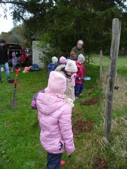 Mit Spaten und Schaufeln haben die Kinder 25 große Löcher gegraben und jeweils vier Blumenzwiebeln mit der Wurzel nach unten hineingesteckt. Nach dieser anstrengenden Arbeit wurden sie mit Tee und Nussecken belohnt.