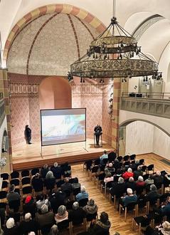 Im Anschluss an die einstündige Mahnwache folgte der Gang zur Synagoge und die Kranzniederlegung. Beigeordnete der Stadt Elfriede Meurer richtete einige Worte an die Teilnehmenden. In der ehemaligen Synagoge begrüßte René Richtscheid vom städtischen Emil-Frank-Institut Gäste und Regisseur Andreas Berg, dessen Film ‚Verfolgt und umworben – Zweitausend Jahre jüdisches Erbe am Rhein‘ (SWR 2021) öffentlich gezeigt wurde. Andreas Berg (*1959) stammt gebürtig aus Wiesbaden, studierte Germanistik, Philosophie und Kunstgeschichte in Mainz und war von 1987 bis 2022 als Fernsehjournalist beim SWF – heute SWR – beschäftigt. Themengebiete der Jüdischen Religionsgeschichte und der Jüdischen Geschichte im Allgemeinen gehören zu den Schwerpunkten seiner Arbeit.