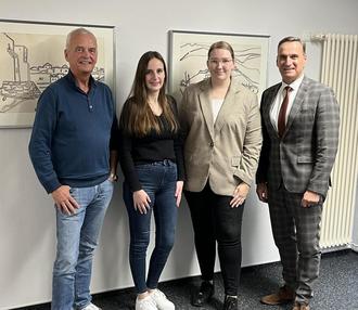 Bürgermeister Joachim Rodenkirch gratulierte Kathrin Linden (2. v. l.) und Selina Schuler (2. v. r.) zum erfolgreichen Bestehen des Verwaltungslehrgang I. und wünschte ihnen weiterhin viel Erfolg. Den Wünschen schloss sich der Büroleiter Rainer Stöckicht (1. v. l.) gerne an