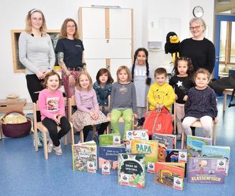 Über den Wanderraben-Rucksack voller Bücher freuen sich die Vorschulkinder der Kita Lüxem…
