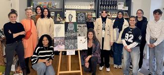 Julia Sterk (Mitte) mit ihren Schülerinnen und Schülern des Kunst-Leistungskurs Jahrgangsstufe 11, links Ellen Helfrich (Kunst an Hecken und Zäunen) und Nina Dusartz de Vigneulle (Kulturamt Stadt Wittlich) (Foto: privat).