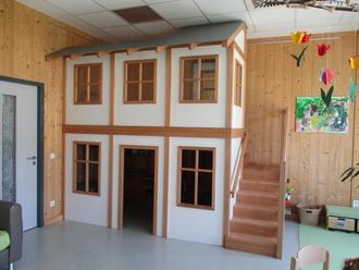 Nachdem die Puppenwohnung mit Pappkartons in ein Märchenschloss verwandelt und ausdauernd und kreativ bespielt worden war, war das Schloss einige Wochen später abrissreif. Den Kindern fehlte ihr liebgewordener Rückzugsort, an dem sie ungestört spielen konnten. Die Kinder ließen nicht locker und fragten nach einer Alternative. Jedes Kind malte und bastelte sein Modell und stellte es im Morgenkreis vor. Bärbel Schloemer, die Leitung der Kita, wurde von den Kindern schriftlich in die Kinderkonferenz eingeladen. Die Ideen wurden ihr vorgestellt. Sie regte an, dass die Kinder ein Modell bauen, wie sie sich ihr Haus vorstellen. Die Kinder machten sich sofort an die Arbeit. Mit unterschiedlichen Materialien fertigten sie das Modell an. Dieses wurden Bärbel Schloemer und Herrn Schon (Schreinerei der JVA Wittlich) von den Kindern vorgestellt. Herr Schon versprach die Ideen der Kinder zu berücksichtigen. Dann war es schließlich soweit: das Spielhaus wurde von der Schreinerei der JVA Wittlich aufgebaut. Die Kinder verfolgten den Prozess sehr aufmerksam und auch bei der ersten Begehung wurde alles genau unter die Lupe genommen. Mit einem Richtfest wurde das Haus gebührend gefeiert.