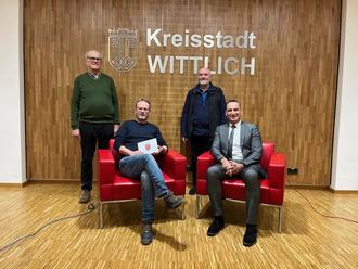 v.l.n.r.: Heribert Geiter, Erwin Holl, Klaus Scholz,, Hermann Haller (vorne sitzend links) im Interview mit Bürgermeister Joachim Rodenkirch (Foto: Melanie Becker).