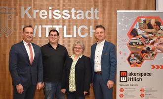 Die Stadt Wittlich und Westenergie setzen ihre Partnerschaft fort (v. l.): Bürgermeister Joachim Rodenkirch, Julian Nikolay (Makerspace), Annette Münzel (Makerspace) und Marco Felten (Westenergie-Regionalmanager).