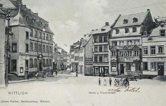 Abbildung: Marktplatz um 1905 mit den Gasthäusern (v.l.n.r.) Weins „Zum Türmchen“, Hotel Fier „Zur Post“, Hotel Well „Zum Wolf“ und Neuerburg „Zur Krone“, ein beliebtes Motiv, das erworben werden kann. (Foto: Ausstellung)