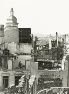 Durch Bomben beschädigte Stadt Wittlich mit Blick auf St. Markus, 1944. Quelle: Bildarchiv des Kreisarchivs Bernkastel-Wittlich, Aufnahme: Foto Becker.