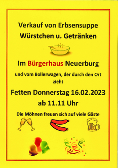 An Weiberdonnerstag den 16. Februar 2023 ab 11.11 Uhr verkaufen die Neuerburger Möhnen ihre schmackhafte Erbsensuppe, Würstchen und Getränke im Bürgerhaus Neuerburg, und vom Bollerwagen der durch den Ort zieht. Die Bevölkerung aus Neuerburg und umliegenden Ortschaften ist zum närrischen Treiben im Bürgerhaus Neuerburg recht herzlich eingeladen. Die Möhnen freuen sich auf viele Gäste.
