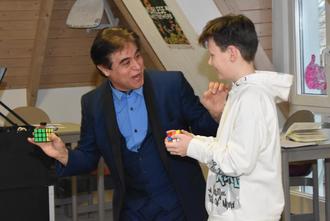 Gelöst in Sekundenschnelle - Magier Hamid und sein junger Assistent drehen am Zauberwürfel (Fotos: Anke Freudenreich).