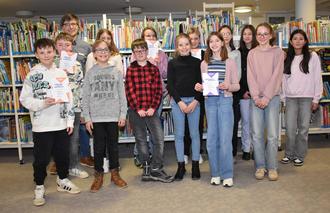 Die Teilnehmenden des Vorlesewettbewerbs mit Fachbereichsleiter Stefan Schmitt (hinten links) und der glücklichen Gewinnerin Hanna Werner (vorne, 2. v. rechts)