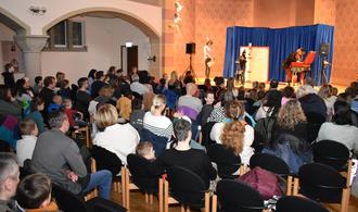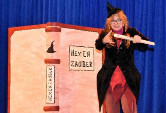 Passend zum Thema erwartete die Kinder und ihre Begleitpersonen ein riesengroßes Hexenbuch auf der Bühne. Gefüllt mit Kochrezepten, Besenreparaturanleitungen und Zaubersprüchen gehörte dieses der Zauberhexe Nudeltraud - gespielt von Irene Englmeier - von der „Kleinen Weltbühne“. Doch irgendetwas stimmte nicht mit dem Buch, denn alle Zaubersprüche gingen daneben. Schuld daran war der freche Bücherwurm Flatterzahn, der das Hexenbuch durcheinanderbrachte, weil ihm das Zaubern nicht gestattet wurde. Lautstark von den Zuschauern unterstützt machte sich Nudeltraud auf die Suche nach dem Übeltäter, den sie aber erst am Ende zur Rede stellen konnte. Zwischendurch kochte sie mit tatkräftiger Hilfe von jungen und älteren Zauberlehrlingen aus dem Publikum eine deftige Schwefelsuppe, jonglierte mit Klobürsten und versuchte sich in verschiedenen Zaubertricks.