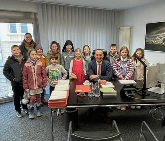 Vergangene Woche besuchten die Schülerinnen und Schüler der Familienklasse der Georg-Meistermann-Grundschule Bürgermeister Joachim Rodenkirch im Rathaus. Die Kinder der Klassenstufen 2 bis 4 hatten die Gelegenheit, ihre klugen Fragen zu Demokratie, Politik und ihrer Heimatstadt zu stellen und beeindruckten den Bürgermeister mit ihrem Wissen und Interesse.
