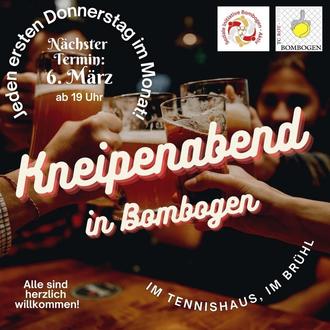 Zusammen mit der Initiative "Bombogen Aktiv" veranstaltet der Tennisclub Rot-Weiß Bombogen im Clubhaus Im Brühl am Donnerstag, 06. März 2025 ab 19 Uhr den nächsten Kneipenabend.