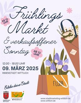 Wir freuen uns auf einen abwechslungsreichen Sonntag voller Einkaufsmöglichkeiten, zufriedene Kunden und Händler und frühlingshafte Schnäppchen in Wittlich. Parken ist auch kein Problem. Wittlich bietet in der Innenstadt über 1500 Parkplätze (Parkplatz Zentrum, Viehmarkt, Kurfürstenplatz und Schlossplatz und Eventum)