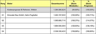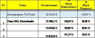 | Nr. | Firma | Gesamtsummebrutto | % (Basis Mindestbieter) | % (Basis Prognose) |