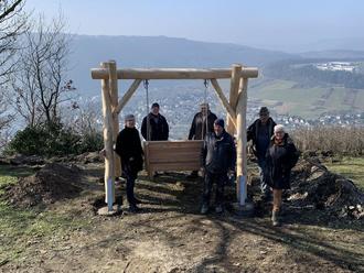 Große Kreise ziehen die Kraniche während ihrem Rückflug aus Portugal, Spanien und Südfrankreich kommend über der Moselschleife bei Traben-Trarbach. Sind es etwa Ehrenrunden über der faszinierenden Moselregion? Aus den Lüften haben die Zugvögel bereits die neue Attraktion am Moselsteig & Moselcamino entdeckt. Die große LorettaSchaukel 250 Meter über dem Fluss erweckt ihre Aufmerksamkeit. An einem der schönsten Aussichtspunkte der Region mit einem fantastischen Blick in und übers Moseltal bis weit in die Eifel hinein, haben Freiwillige vor wenigen Tagen die einladende Wellness-Liege aufgebaut. Die massive Holzkonstruktion wurde in den Werkstätten der gemeinnützigen Gesellschaft Komm-Aktiv in Mayen hergestellt.