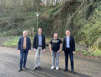 Begutachteten vor Ort die neuen Beleuchtungsanlagen am Parkplatz der Moseltherme in Traben-Trarbach (v. l.): Werkleiter Jens Burch, Bürgermeister Marcus Heintel, Betriebsleiter Bäder Daniel Schön sowie Marco Felten von Westenergie.