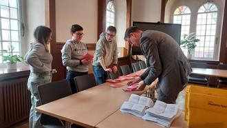 Bürgermeister Heintel und Mitglieder des Jugendparlaments bei der Auszählung der Wahlbriefe