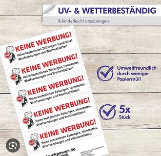 Also, ran an die Aufkleber! Selber machen oder gibt`s im Internet kostenlos zu bestellen bei werbeblocker.de oder letzte-Werbung.de.