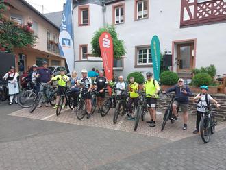 Radler beim Auftakt in Kröv mit Bürgermeister Marcus Heintel (3. vl) und 1. Beigeordnetem Alex Licht (6. vl).