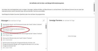Hier können Sie sich dann die gewünschte Sitzung aussuchen und beim Anklicken wird die jeweilige Tagesordnung aufgeführt.