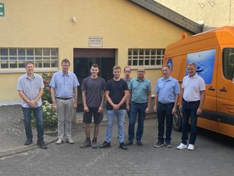 Auf dem Foto (v.l.n.r.): Technischer Werkleiter Manfred Christ, Bürgermeister Marcus Heintel, Johannes Alt, Julius Janshen, Wassermeister Achim Knod, kaufmännischer Werkleiter Jens Burch, Abwassermeister Jan Keppler, Abwassermeister Frank Pohl.