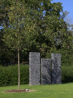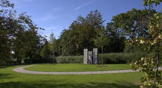 Im Zentrum des neuen Areals zieht ein halbkreisförmiger Fußweg die Blicke auf sich. Dieser Weg, sorgfältig angelegt, rahmt drei imposante Natursteinstelen ein, die symbolisch für die Kraft und Beständigkeit dieser letzten Ruhestätte stehen. Für die Verblendung wurden Natursteine aus regionalem Material verwendet. Innerhalb des Halbkreises wurden zudem zwei große Hopfenbuchen gepflanzt, die dem Ort eine natürliche und friedliche Atmosphäre verleihen.