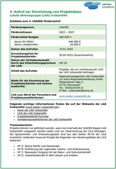 In dem vierten Förderaufruf der aktuellen Förderperiode werden insgesamt 460.000 € zur Förderung von Vorhaben zur Verfügung gestellt. Das Budget setzt sich aus 440.000 € EU-Mitteln und 20.000 € Landesmitteln zusammen. Vorhaben, die gefördert werden können, sind solche, die innerhalb der LEADER-Region der LAG Vulkaneifel umgesetzt werden sollen und zur Zielerreichung der Lokalen Integrierten Ländlichen Entwicklungsstrategie (LILE) beitragen. Dabei muss ein Vorhaben insbesondere die vier Handlungsfelder der LILE (Aktive Dörfer und Gemeinden, Profilierung des regionalen Lebens- und Arbeitsraumes, Bewusster Umgang mit der Natur- und Kulturlandschaft und Vulkanlandschaft in Wert setzen und erleben) bedienen.