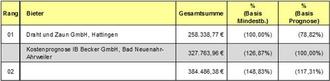 Die Angebotssummen für die Lose 1 und 2 belaufen sich auf insgesamt 318.726,28 €/brutto. Die Kostenprognose des Ingenieurbüros belief sich aufgrund der durchgeführten Anpassungen auf 452.077,31 €/brutto.