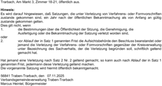 Es wird darauf hingewiesen, daß Satzungen, die unter Verletzung von Verfahrens- oder Formvorschriften zustande gekommen sind, ein Jahr nach der öffentlichen Bekanntmachung als von Anfang an gültig zustande gekommen gelten.