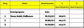 | Rang | Bieter | Gesamt- summe brutto | % (Basis Mindestb.) | % (Basis Prognose) |