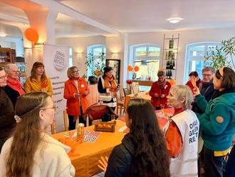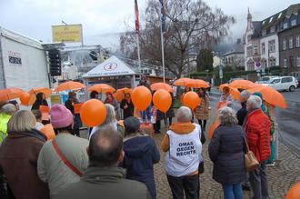 Die Gruppe „Omas gegen rechts“ verschenkten orangene Luftballons und Mandarinen die mit der Hilfetelefon-Nummer beschriftetet waren. Im Anschluss an diese Aktion wurde im Blauen Haus auf Einladung der „Omas gegen rechts“ das Thema bei Kürbissuppe weiter diskutiert. Die Schule ohne Rassismus AG des Gymnasiums Traben-Trarbach kam etwas später ebenfalls dazu, um orangene Handabdrücke mit stärkenden Botschaften zu verteilen. Frauen und Mädchen aus drei Generationen tauschten ihre Gedanken zur Zukunft unserer Demokratie aus. Trotz des erschütternden Thema waren alle froh, dabei gewesen zu sein.