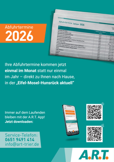 Auch im Jahr 2026 können sich die Bürger im Landkreis Bernkastel-Wittlich wieder über verschiedene Wege über die Abfuhrtermine für ihre Abfälle informieren. Wie gewohnt sind die neuen Termine ab sofort auf der Webseite https://www.art-trier.de/abfuhrtermin einsehbar. Dort kann der persönliche Abfuhrkalender für den eigenen Ort heruntergeladen und für die Pinnwand ausgedruckt werden. Auch ein Erinnerungsservice per E-Mail oder die Möglichkeit zum Import der Abfuhrtermine in einen digitalen Kalender stehen zur Verfügung. Wer bequem per Push-Benachrichtigung an seine Abfuhrtermine erinnert werden möchte, lädt sich einfach die A.R.T. App aufs Handy.
