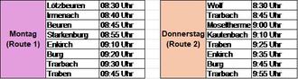Für die Fahrten montags kann die Anfrage auch noch bis Sonntag, 18 Uhr, an die Tel.-Nr.: 0 65 41 / 67 28 (Anrufbeantworter) erfolgen.